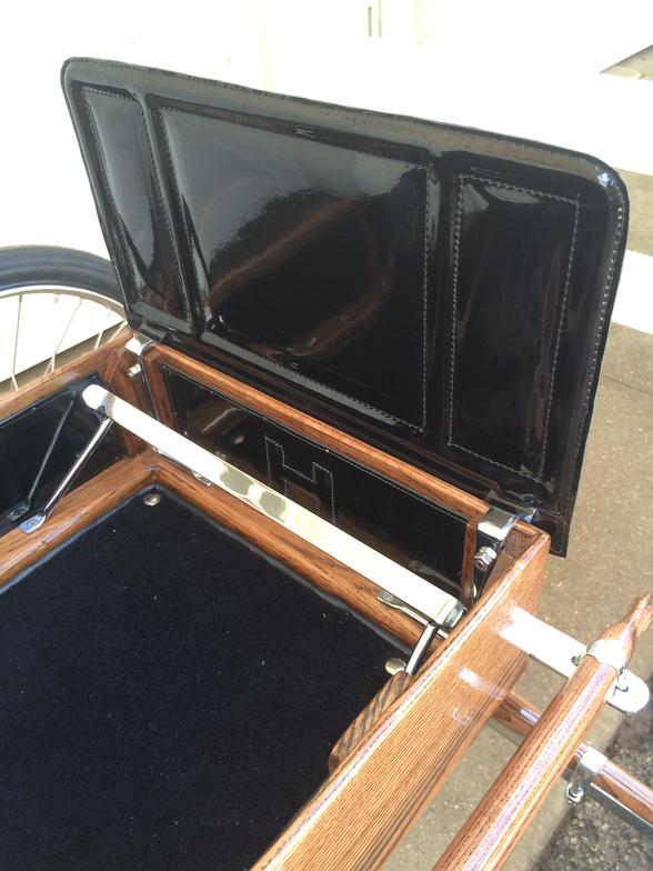 The Houghton Super Deluxe Matinee Fine Harness Buggy has a natural blond wood under carriage- natural axle cap and natural side rail - with a painted body. It features: